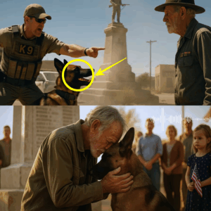 As Joe stood motionless before the war memorial, a police officer approached with suspicion and protocol. The tension thickened when a K9 unit was called, and Ranger—trained for obedience, not questions—was unleashed. But something extraordinary happened. At Joe’s whisper, “Ranger, easy now,” the dog froze, recognition dawning in his eyes. The crowd watched in awe as Ranger, breaking every rule, crawled to Joe, signaling a reunion decades in the making.