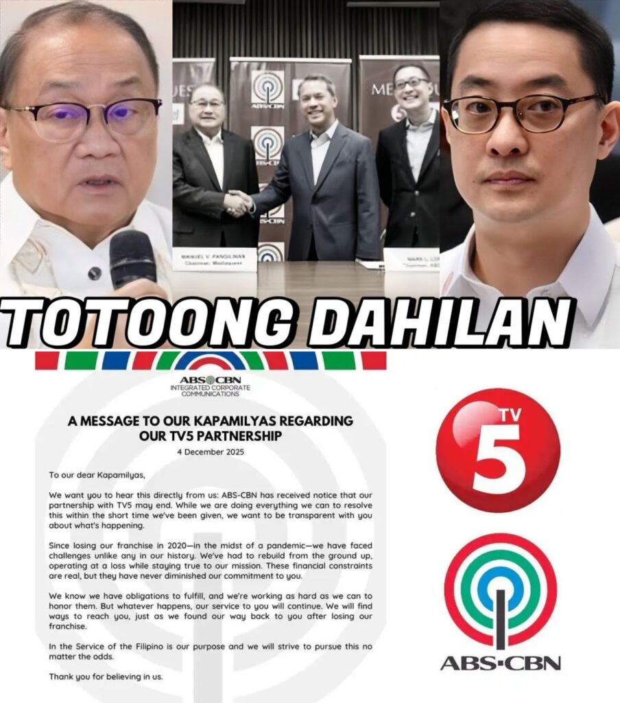 Sa industriya ng telebisyon kung saan bawat hakbang ay sinusukat, bawat desisyon ay pinagmamasdan, at bawat pagkakamali ay lumalabas sa lahat ng headlines, isang napakalakas na lindol ang yumanig sa buong media landscape ng Pilipinas. Walang pumansin noong una; tahimik ang paligid, tila parang ordinaryong araw lang sa dalawang higanteng network. Ngunit sa loob pala ng boardrooms, umiinit na ang tensyon—na para bang isang bomba ang naghihintay lamang ng tamang oras para sumabog. At nang tuluyang kumalat ang balita na TV5 Network ay TINAPOS ang partnership deal nito sa ABS-CBN, halos hindi makapaniwala ang mga tao. Lalo pang umugong ang balita nang kumalat ang alegasyon: “Hindi raw nagbabayad ng revenue share ang ABS-CBN.” Sa isang iglap, ang dating pinag-uusapang collaboration ay naging pinakamainit na network conflict sa taon.