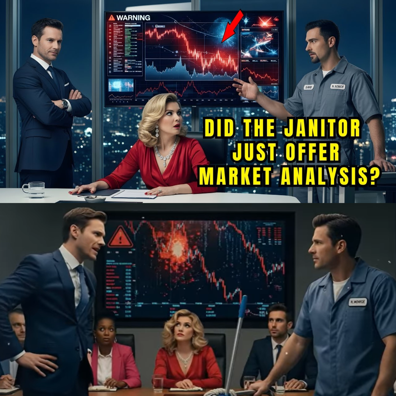 The algorithms collapsed like dominoes, red warnings bleeding through every monitor on Safeguard Financial’s trading floor. CEO Ranata Chen’s fingers trembled against the mahogany conference table as another billion evaporated into digital smoke. The emergency board meeting had stretched past midnight, voices sharp and desperate, when the janitor entered through the service door—his mop bucket squeaking once against the marble. “The Fibonacci sequence,” Nate whispered, unable to stop himself as he stared at the cascading numbers. “They’re running it backwards.” Every head in the room turned; Landon Pierce, the vice president, smiled like a card player holding aces. Ranata’s exhausted eyes focused on the man in the gray uniform—the one who emptied their trash and polished their ambitions away each night. Did the janitor just offer market analysis? Landon’s voice dripped honey over broken glass.